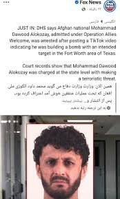 د دید خبري اژانس: د محمد داود الکوزي په نوم یو افغان په ټګزاس کې نیول شوی. هغه په ټیک ټاک کې د ژوندۍ ویډیو خپرولو په تور نیول شوی چې پکې هغه د بم جوړولو ښودنه کوي. د بم جوړولو وروسته یې د چاودنې ګواښ وکړ.