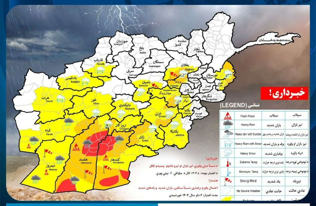 د دې سازمان د اعلان له مخې، سبا (دوشنبه، د دلو ۶) د نورستان، کونړ، بغلان، پروان، لوګر، پکتیا، پکتیکا، میدان وردګ، بامیان، غزني، زابل، ارزګان، دایکندي، غور، کندهار، هلمند، نیمروز، فراه، هرات، بادغیس او فاریاب ولایتونو کې د سالنګ لارې په ګډون د دې هوا حالت وړاندوینه شوې ده.