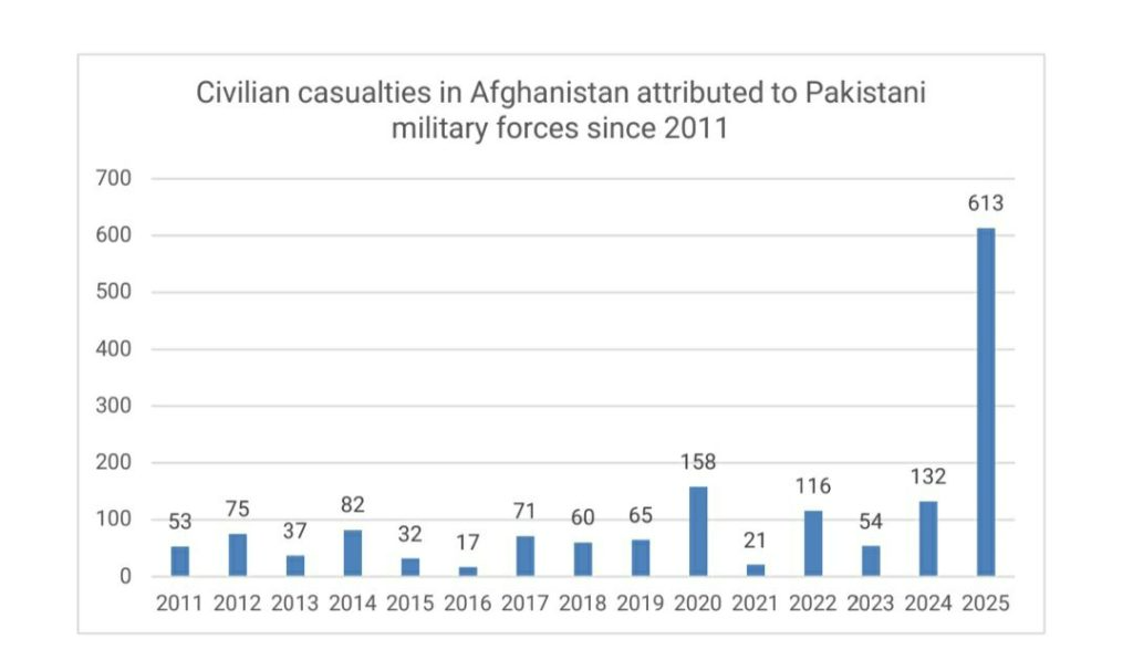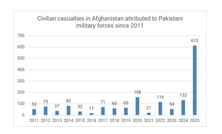 د راپور له مخې، د ۲۰۲۵ کال د اکتوبر د ۱۰مې او ۱۷مې ترمنځ د ۸۵ سلنې څخه زیاتې مرګ ژوبلې رامنځته شوې، په ورته وخت کې چې د افغان امنیتي ځواکونو او پاکستاني پوځ ترمنځ پوځي تاوتریخوالی زیات شو.