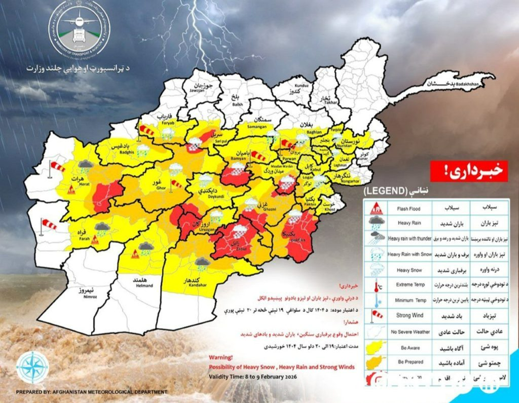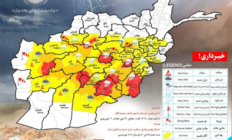 د ترانسپورت او هوايي چلند وزارت د هوا پېژندنې ادارې اعلان کړی چې سبا (د دلو ٢۰مه) به د کابل، نورستان، ننګرهار، لغمان، پنجشیر، پروان، کاپیسا، بغلان، سمنګان، لوګر، پکتیا، پکتیکا، خوست، میدان وردګ، بامیان، دایکندي، غزني، زابل، ارزګان، کندهار، هلمند، فراه، هرات، غور، بادغیس، فاریاب او سرپل ولایتونه د سالنګ په ګډون د واورې او باران شاهد وي.