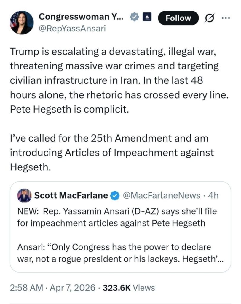 د دید خبري اژانس: له واشنګټن څخه راپورونه ښيي چې د امریکا په اساسي قانون کې د ۲۵م تعدیل د پلي کولو او د جګړې د وزیر د استیضاح غوښتنه په کانګرس کې پیل شوې ده.
