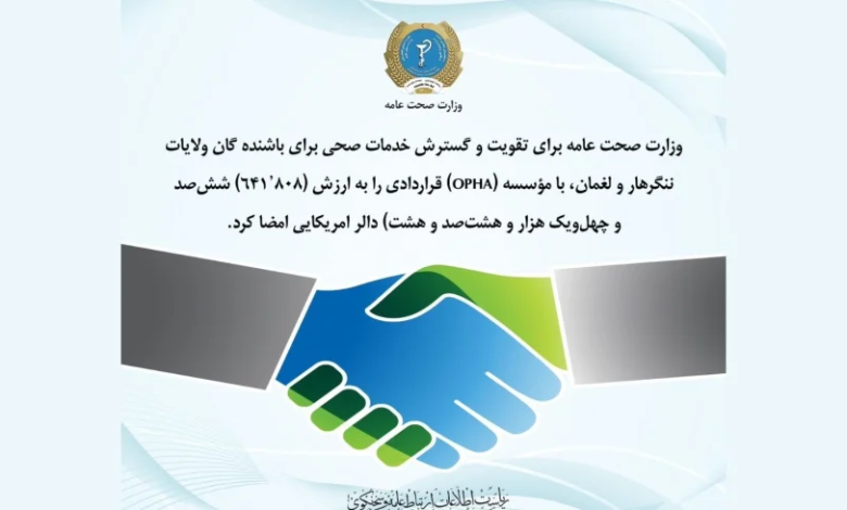 د دید خبري اژانس: د عامې روغتیا وزارت اعلان وکړ چې د ننګرهار او لغمان ولایتونو کې د روغتیايي خدماتو د ښه والي او پراخولو لپاره د OPHA موسسې سره د ۶۴۱،۸۰۸ ډالرو په ارزښت قرارداد لاسلیک شو.