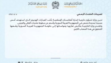 د دید خبري اژانس: د طالبانو حکومت د بهرنیو چارو وزارت د سوریې په حمص ښار کې د شیعه ګانو پر جومات د ترهګریز برید په غندلو سره یوه اعلامیه خپره کړه او دا یې د انساني او اسلامي ارزښتونو…